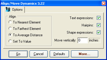 From the Plug-ins menu, choose TGTools, then Align/Move Dynamics.