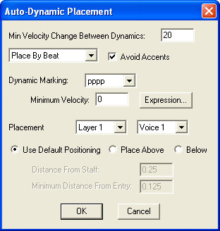 The Auto-Dynamic Placement plug-in allows you to place dynamics in your score automatically based on the recorded MIDI key velocity. You can specify the range of key velocities associated with each dynamic.