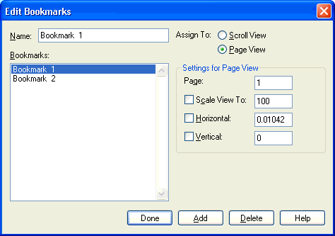 From the Bookmarks submenu of the View menu, choose Edit Bookmarks. The Edit Bookmarks dialog box for the current view (Page or Scroll View) appears.