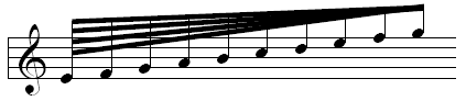 In some music, ritards and accelerandi are notated with converging secondary-beam angles in a technique called feathered beaming. In the case of the ritard, the player increases the rhythmic values gradually from the faster values, at the left end, to the slower values, on the right end, as shown below.