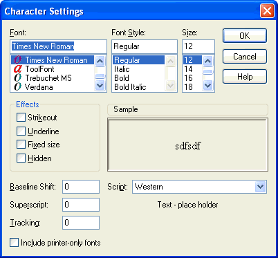 Character Settings dialog box