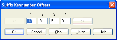 In this dialog box, you can define the voicing you want Finale to use when it plays back the chord suffix you clicked. Each note of the chord is identified by a number that represents its interval, in half steps, from the root; this number is called the keynumber offset. Either enter each keynumber offset in a text box and click the right and left arrows to scroll the display, or—more efficiently—click Listen and play the chord in whatever voicing you prefer (see Listen dialog box); you can build a suffix of up to sixteen notes. A negative number specifies a note that’s been played below the root of the chord, and a positive number specifies one above.