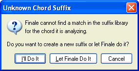 When Finale encounters a chord it doesn’t recognize, this dialog box appears, asking how to handle the situation. (You can dramatically decrease the number of times this box appears if you load a Chord Suffix Library into your piece—or if you have the Maestro Font Default file in place, which already has a Chord Suffix Library loaded.)