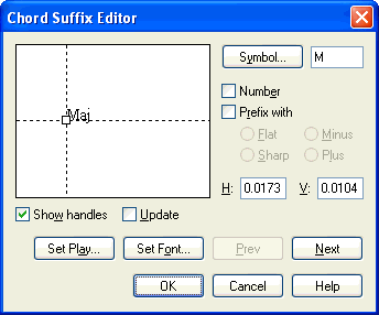 Each letter of the suffix can have its own font, size, and position, making subscript and superscript numbers (for example) possible. You can only edit one character of the suffix at a time, moving among the characters with the Prev and Next buttons. You use the Chord Suffix Editor dialog box both to define the graphic appearance of the suffix and to specify a voicing for a chord’s playback.