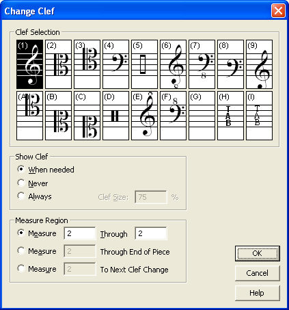 In this dialog box you specify which clef you want to use and tell Finale whether you want it to occur at the beginning of the measure or somewhere in the middle.