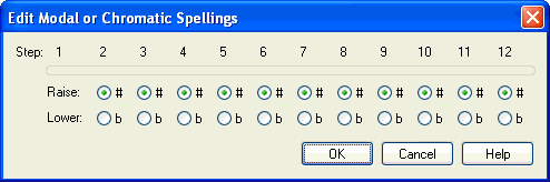 Use the Edit Modal or Chromatic Spellings dialog box to change the enharmonic spelling Finale will use for chromatically altered notes in modes and chromatic scales. Finale uses this table if Use Spelling Tables is selected in the Enharmonic Spelling submenu and Finale detects a mode or chromatic key created in the Non-Standard Key Signature dialog box.
