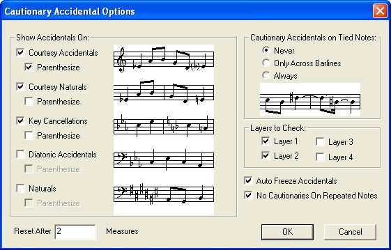 The Cautionary Accidentals plug-in allows you to add cautionary accidentals in various forms to your document. Click all the options (with or without parentheses) to have accidentals display on all notes. The plug-in works only on standard major and minor keys.