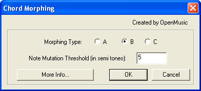 The Chord Morphing plug-in creates a new staff with a sequence of chords, each of a whole note duration. An asterisk will mark the division between sequences. The sequences will consist of the original input chords plus a number of new intermediary chords inserted between them. This plug-in was designed to be a compositional tool capable of automatically generating a variety of smooth between-chord transitions from which the user could pick and choose.