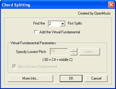 The Chord Splitting plug-in creates a new staff or staves containing subsets of the original chord, each a whole note in duration. These subsets are based on harmonic targets that were implicitly contained inside the original chord. This plug-in was designed to be a composition/orchestration utility capable of automatically generating several simplified subsets of a more complex chord.