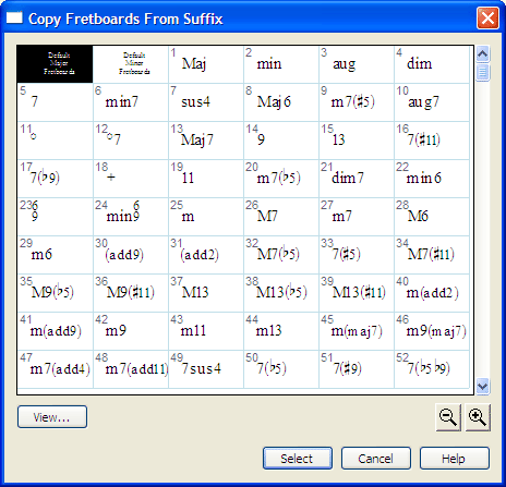 The Copy Fretboards from Suffix Selection dialog box allows you to use fretboards from other chord suffixes.