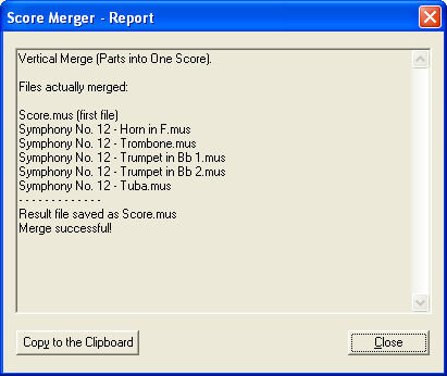 In addition to merging files horizontally, Score Merger can also consolidate several part documents into a single document in order to generate a conductor's score. Score merger can automatically assign groups, MIDI channels, and deals with expressions and page layout.