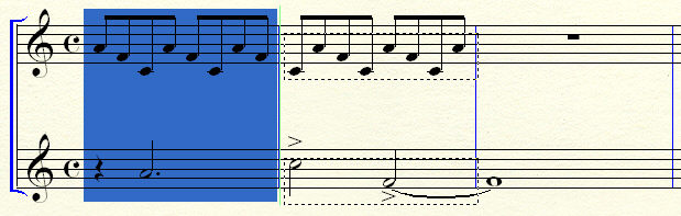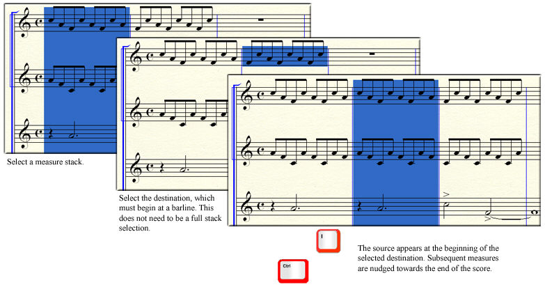 Full measure stacks can also be inserted using the clipboard or by dragging, shifting all subsequent measures to the right in all staves. Rebar music does not apply when inserting stacks because the subsequent music is nudged in full measure increments (so notes cannot be nudged across barlines).