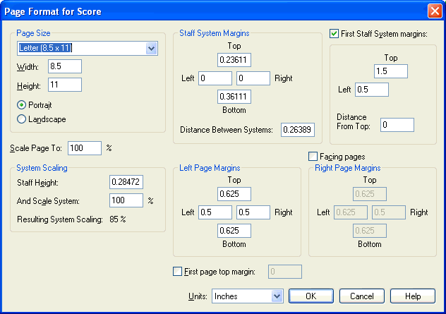 Page Format for Score dialog box