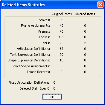 This dialog box displays the deleted items that were no longer used by the document. For example, every Finale document includes a list of fonts and information about those fonts required by the document. When a text block is deleted and a particular font from that list is no longer used anywhere in the document, the reference to that font is no longer required. This type of unused data is removed during the "Remove Deleted Items" procedure, which examines every bit of text, compares the existing fonts to the list of fonts in the document, and removes the unnecessary data. The results of this procedure are listed in this dialog box.