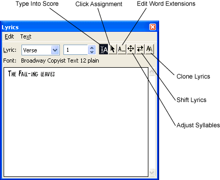 The Edit and Text menus are available when the window appears so you can copy and paste text, change fonts and styles, and carry out other editing tasks. Note that only the Text menu commands that affect the display of text characters are available for lyrics; the Line Spacing and Edit Page Offset commands as well as the commands in the Inserts and Justification submenus are not available.
