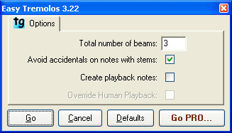 Some options enable fine-tuning tremolo notation (such as the number of beams). The plug-in can be re-applied to change the options on an existing tremolo: for example, to change the number of beams or add playback notes. The plug-in won’t revert tremolos back to normal notes.