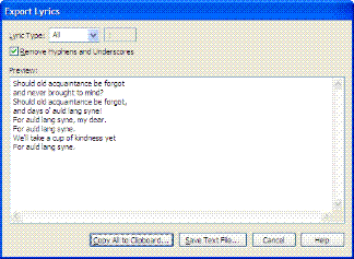 The Export Lyrics dialog box allows you to save the lyrics in your file to a text file. These lyrics could then be imported into a word processor for spell-checking or sent to a lyricist for collaborations. You may choose to export all lyrics, all lyrics of a specified type, or any single lyric of a specified type.
