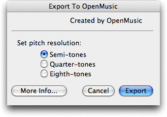 The Export To OpenMusic plug-in copies the selected music to the clipboard in a format that can be pasted into the OpenMusic Software. For details, see your OpenMusic documentation.