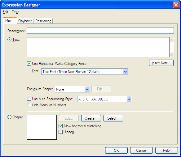 - Font. Use this drop-down menu to switch between entering text and musical symbols. The text and music font can be defined for each category of expressions. The text and/or music font for a category can be changed in the Category Designer dialog box. Uncheck Use Category Fonts to display additional font options that you can use to apply to this particular expression (independent from the category).