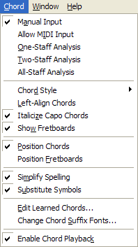 Use the chord menu to specify how you want to add, define, or change chord symbols and fretboard diagrams.