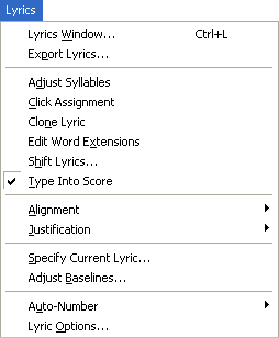 The Lyrics menu contains all the commands you’ll need to create and edit lyrics, distribute the text in the score, adjust the positions of individual syllables, draw word extensions for syllables that are sustained, and so on.