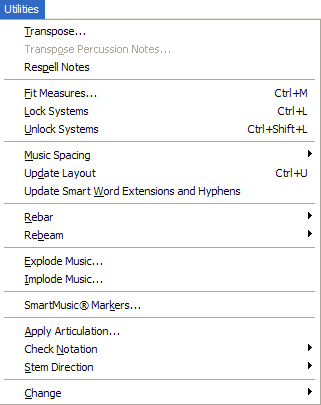 The Utilities menu is one of the most versatile menus in Finale. Its commands transform your music in many powerful ways. Its commands work on selected regions as small as a single beat, or as large as the entire score. All the commands described below work on partial or full-measure selections, except as noted otherwise. Select a region with any tool that supports measure selection and these commands are available.