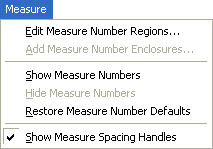 This menu includes options for working with measure numbers, measure number regions, and measure spacing. For information regarding adding, moving, copying, inserting, or deleting measures, see Edit menu.