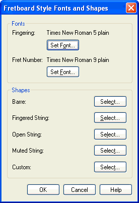 In this dialog box you can define the fonts for fingerings and fret numbers. You can also define the shapes for barre symbols, open or muted strings and other symbols.