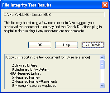 The Test File Integrity dialog box displays a message stating whether it found inconsistencies in the file. Click on Details to display the types of items that were repaired in your score.
