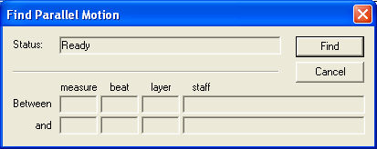 The Find Parallel Motion plug-in is used to find the parallel fifths and octaves in a region of selected music. The plug-in compares notes found in different voices, layers and staves.