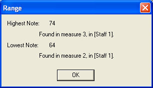 After invoking the Find Range plug-in, a dialog will be displayed listing the highest and lowest notes found in the selection. The dialog will also indicate the staff and measure in which these notes first occurred. The plug-in will also scroll the document so that at least one of these notes will be visible (it scrolls to the note that occurs first). The Find Range plug-in always uses MIDI note number, regardless of the Display Pitch setting in the View portion of the Program Options dialog box. See Program Options-View.