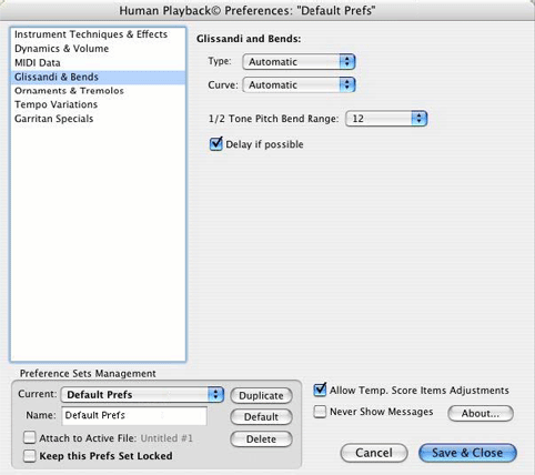 The default set of Human Playback Preferences is called "Default Prefs." This is the set that is used for all Finale files unless you specify otherwise. If you make any changes to your Human Playback Preferences, they will automatically be saved to this set (unless you check "Keep this Prefs Set Locked").
