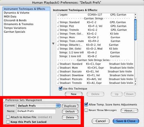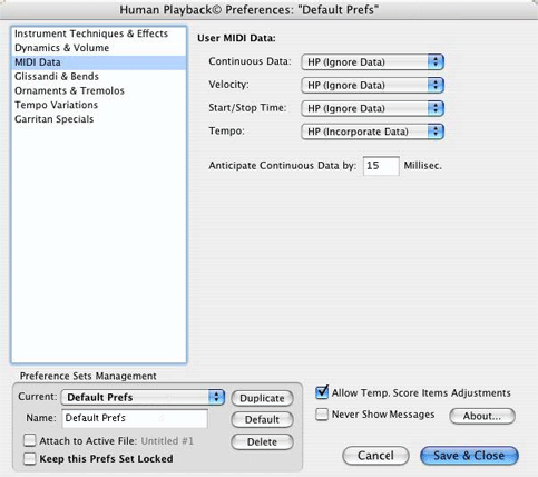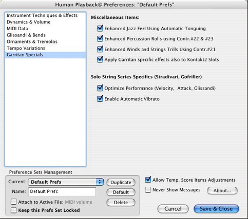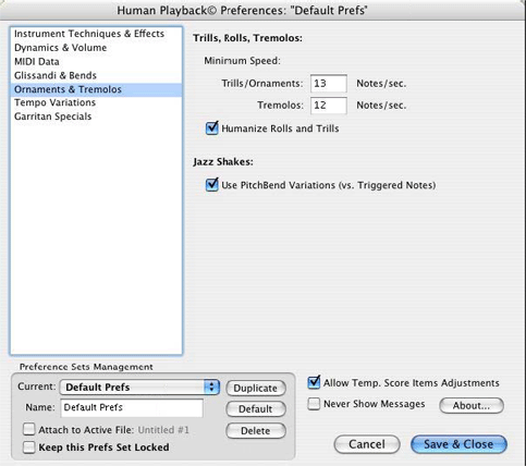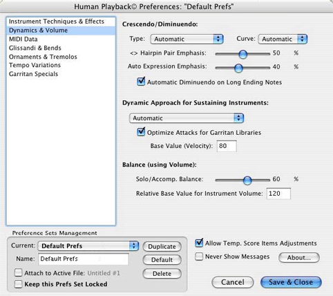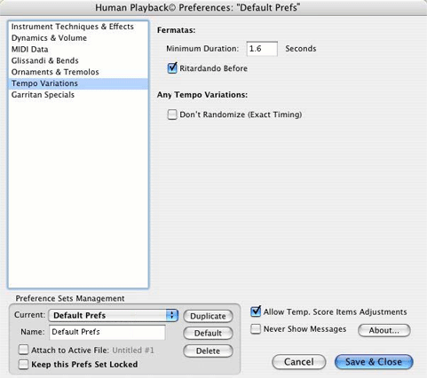 If you have made changes to this set but later decide you want to discard them, click the "Default" button to revert to the original settings. You can also save a copy of the original settings, or create additional customized sets, by clicking the "Duplicate" button. Click the "Attach to Active File" checkbox if you want the current set of Human Playback Preferences to be saved with the document you are working on. A Human Playback Preferences set that has been attached to a Finale document will temporarily override the currently selected set whenever that document is opened. "Keep this Prefs Set Locked" protects the active set and prevents any changes from being made to it.