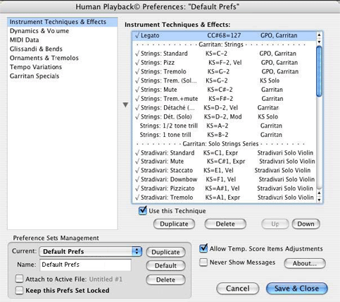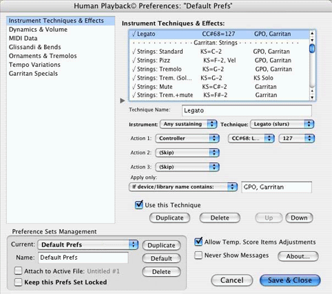 The options in this section control how Human Playback interprets instrument-specific performance techniques like pizzicato, mutes, and so on. You can enable and disable individual techniques, and customize the default techniques. The default Human Playback Preferences set contains pre-defined techniques for use with Garritan Instruments for Finale, Full GPO, JABB, and even Garritan Stradivari Solo Violin. Many of these techniques depend on loading the keyswitched version of the instrument and using the appropriate expression, articulation, etc., as a trigger - see the section on Keyswitches.