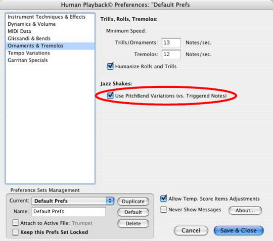 In most jazz scores, a wavy line or trill indication above a note in a brass instrument's part indicates a rapid lip trill, called a shake. In the Ornaments and Tremolos pane of the Human Playback Preferences dialog box, there is an option to interpret a horizontal wavy line - either the Smart Shape or the ~ articulation - as a pitchbend trill, which more accurately resembles a jazz shake: