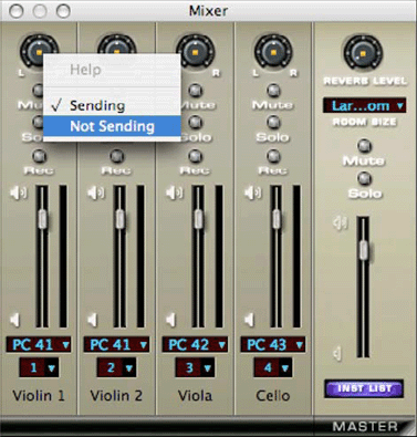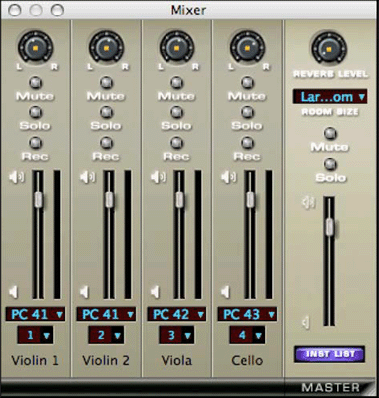 Finale’s mixer is laid out just like a real mixing board, with a volume slider, a pan dial, and mute and solo buttons for each instrument, as well as a Master volume control at the far right. Here’s what the Mixer looks like for a string quartet: