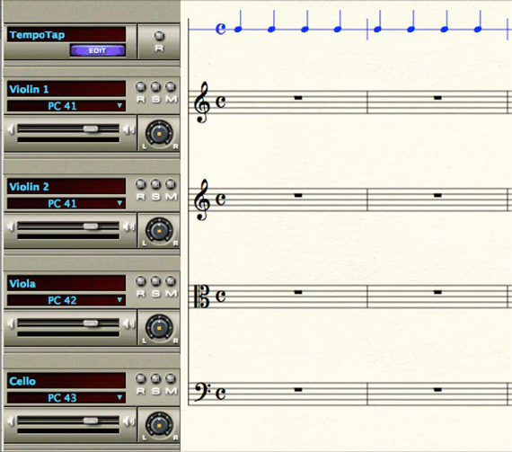 Studio View is very much like the Mixer, except that the controls are arranged horizontally instead of vertically, and there is no Master control. Also, there is an editable TempoTap Staff at the top of the score, which allows you to record custom tempo changes. (For more information, see TempoTap).