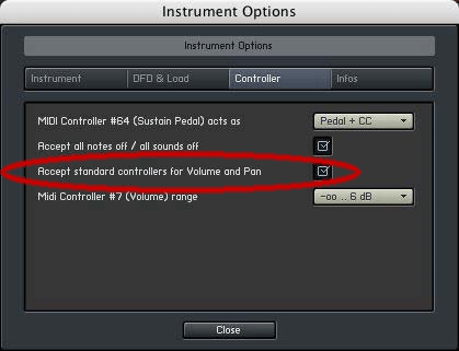 This brings up the Instrument Options dialog box. The setting "Accept Standard Controllers for Volume and Pan" should be checked. (Again, this is checked by default for all Garritan Instruments for Finale Instruments.)