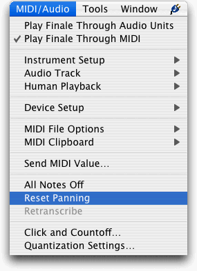 However, if you are preparing an existing file for Garritan playback, Finale uses the default panning (64, i.e., dead center) for all newly created instruments. In order to obtain the best stereo image for existing files, after you have configured them for Garritan instrument playback, you should choose Set Panning from the MIDI/Audio menu.