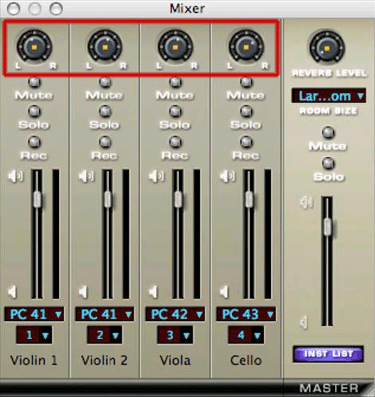 You can also customize the panning for individual instruments by clicking and dragging on the pan dials in the Mixer: