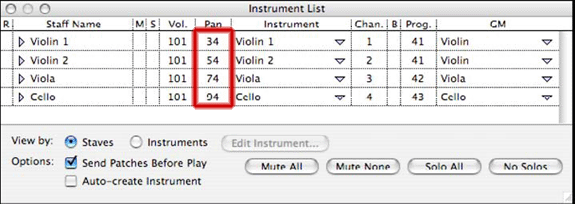 Unlike the dials in the Aria/Kontakt Player (which are adjusted by dragging straight up or down), to adjust the panning dials in Finale, you drag the white dot on the dial into position using a circular motion. However, some find it difficult to make accurate panning adjustments using the Mixer’s interface. As an alternative, you can adjust the panning by typing numeric values in Finale’s Instrument List: