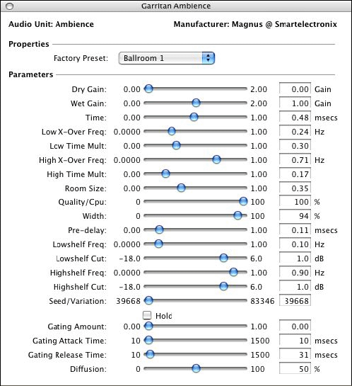 The Factory Preset pull-down menu allows you to choose from a number of preset room sizes - various ballrooms, concert halls, jazz clubs, etc.