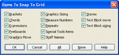Use the Items to Snap dialog boxes to select the types of items that will be affected by the snapping function.
