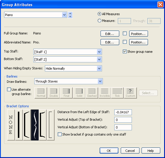 - All Measures • Meaures _ Through _. Choose All Measures to assign this group to all systems in the score. Or, in these text boxes, enter the measure range for the group to assign it to specific systems. So long as a measure is in this range, and begins a staff system, the bracket will appear. (Note that when you delete a bracket on an individual system, Finale automatically creates new bracket definitions for the measure ranges before and after the deleted bracket. See To