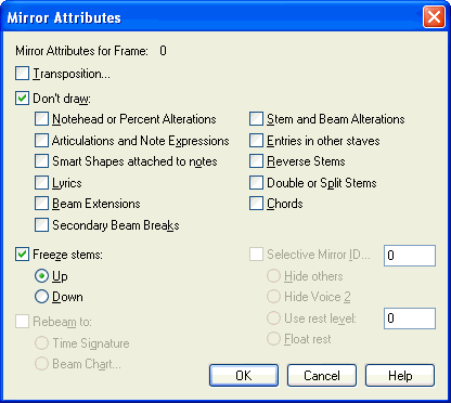 A mirror is an intelligent copy of an existing (or "source") measure in the score. When you edit the source measure in any way, all mirrors created from it are instantly updated to reflect the change. In this dialog box, you can specify certain ways in which you want the mirror to differ from the source measure. For example, you could specify that it be transposed up an octave (if, say, it’s doubling another instrument in the score). You can also specify stem direction, beaming, and whether or not you want various other elements (lyrics, chord symbols, and so on) to appear in the copy.