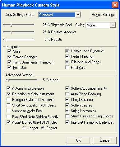 From the MIDI/Audio menu, choose Human Playback, then Custom.