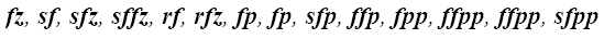 cresc, crescendo, en augmentant, augmentez, erhebend, aufschlagend, dim, dimin, diminuendo, decrescendo, decresc, decr, perdendosi, smorzando, smorz, en diminuant, en s’éloignant, en atténuant, abnehmend, nachlassend, nachgebend, fz, sf, sfz, sffz, rf, rfz, fp, fp, sfp, ffp, fpp, ffpp, ffpp, sfpp |