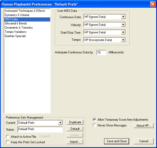 All four of these settings apply to any MIDI data added to the score. For example, the Continuous Data setting applies to all continuous data, whether defined with an expression, or the MIDI Tool.
