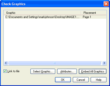Finale doesn’t actually embed a graphic in your Finale document when you place a graphic. Instead, it places a link to the graphic’s location on your computer. Use the Check Graphics dialog box to display the location and full name of all graphics files placed into your score.
