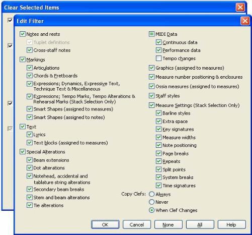 IMPORTANT: The settings for copying (Edit menu > Edit Filter) in the Edit Filter dialog box are program-wide. That means these settings apply to all documents when copying music, even after closing and restarting Finale. If you are unsure of previous settings be sure to review this dialog box prior to copying to ensure it is set up as desired. In contrast to copying, the Clear Selected Items dialog box invoked for clearing items (Edit menu > Clear Selected Items) is session-specific and resets after each use.
